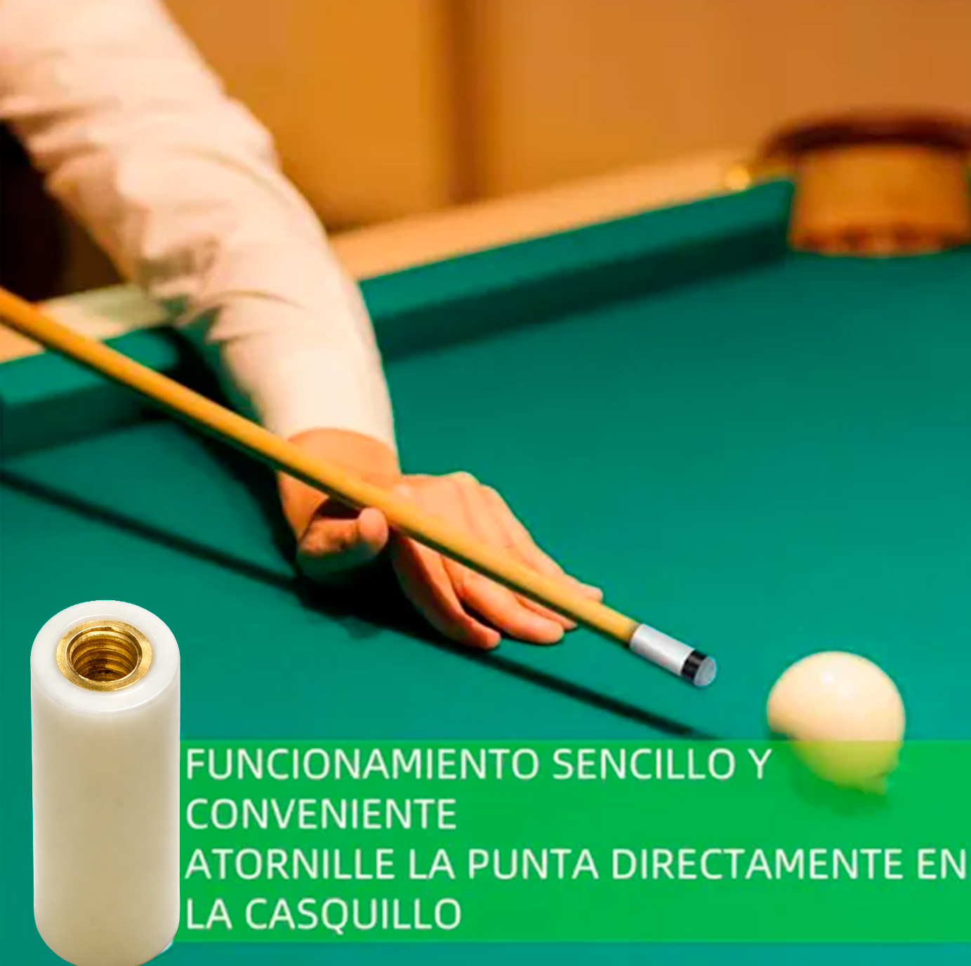 Este producto corresponde a un par de boquillas plásticas con hilo, compatibles con tacos de pool de 11 mm, ofreciendo un ajuste firme y estable que mejora la sensación de golpeo y el control durante el juego.
