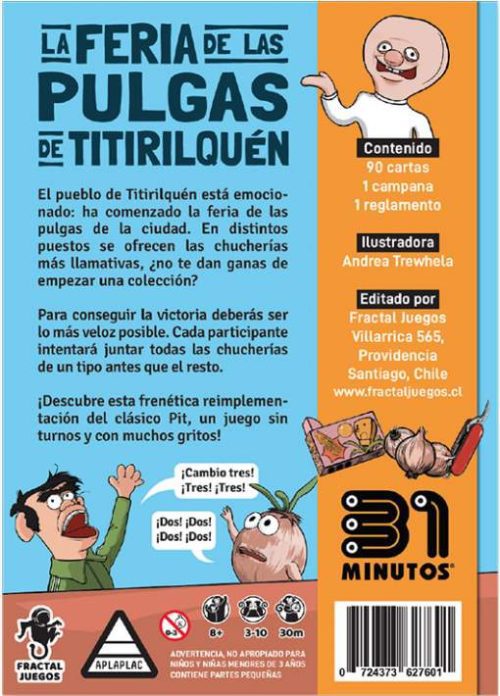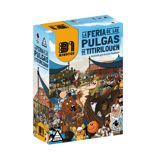 La Feria de las Pulgas de Titirilquén es un juego de mesa 31 Minutos repleto de caos, risas y velocidad. Inspirado en el famoso programa de televisión chileno, transporta a los jugadores al pintoresco pueblo de Titirilquén, donde todos compiten por reunir las chucherías más extravagantes de la feria antes que los demás.
