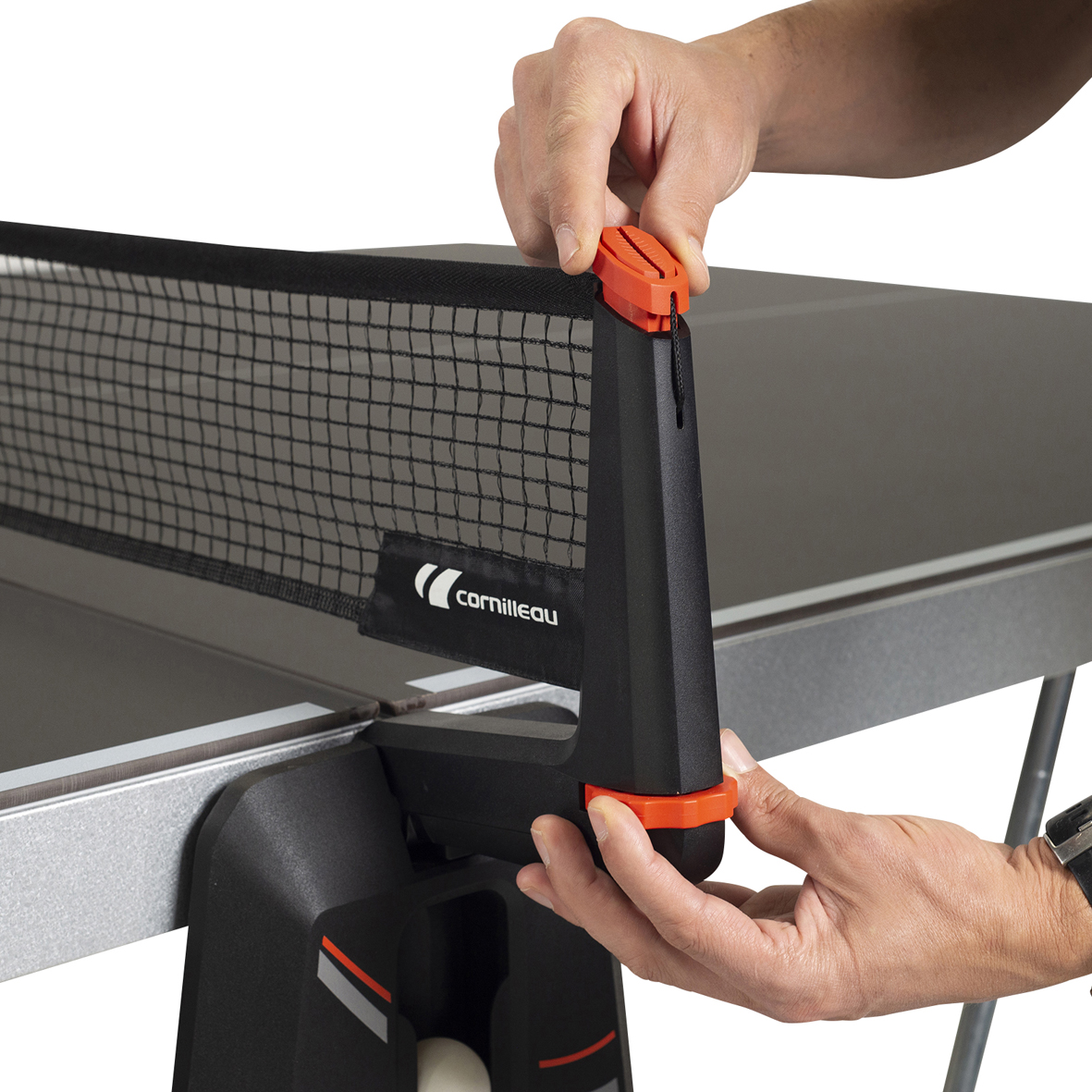 Seguro que acierta con la 500X. Cuando despliega su mesa, los postes de la red se colocan en su lugar automáticamente. Seleccione la altura adecuada para su juego usando el dial en la base de la red. Luego ajuste la tensión simplemente tirando de la cuerda y bloqueándola con el broche. Su red está perfectamente ajustada y mesa lista para jugar.
