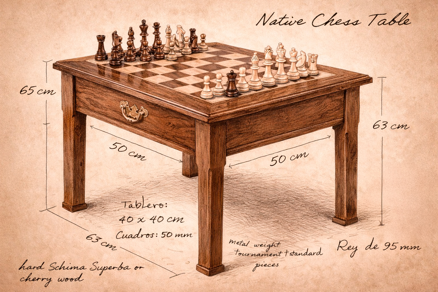 Presentamos la Mesa de Ajedrez Nativa, una pieza excepcional diseñada para los verdaderos amantes del ajedrez. Con dimensiones de 65 x 50 x 63 cm, su tablero de 40 x 40 cm tiene cuadros de 50 x 50 mm, ideal para piezas estándar de torneo, con un rey de 95 mm.