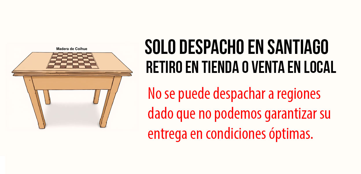 Finísima Mesa nacional Fabricada con patas de madera nativa de Coihue y un tablero de trupan de 18 mm enchapado en Haya, esta mesa no solo es funcional, sino también estéticamente atractiva, con un elegante filete en Palo de Rosa que resalta su calidad artesanal. Además, cuenta con un cajón especial que permite guardar las piezas de ajedrez, naipes y fichas de forma ordenada y segura.