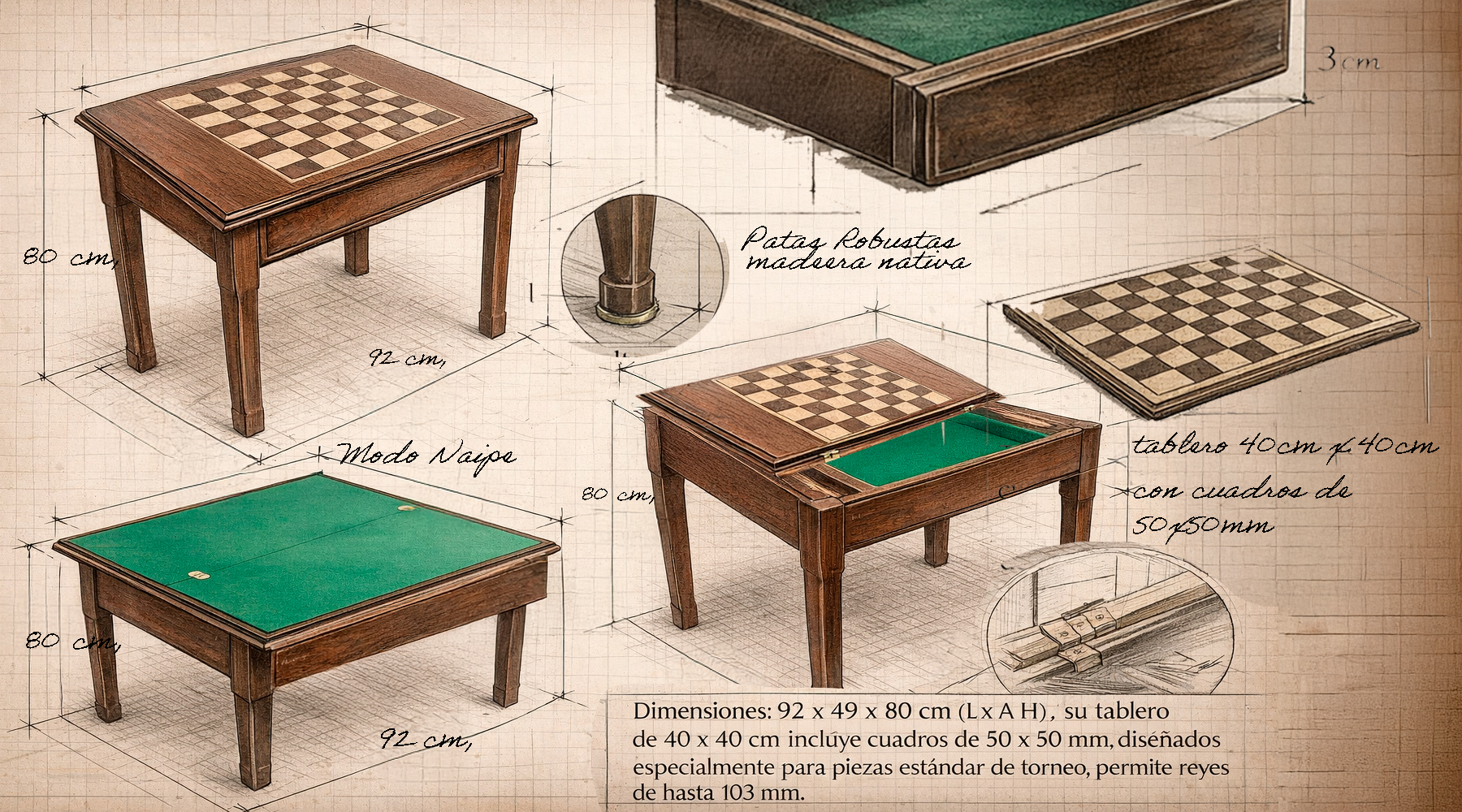 Una pieza ideal para jugar ajedrez y naipes. En modo "Ajedrez" (plegada) tiene dimensiones de 92 x 49 x 80 cm (L x A x H), su tablero de 40 x 40 cm incluye cuadros de 50 x 50 mm, diseñados especialmente para piezas estándar de torneo, permite reyes de hasta 103 mm. En modo "Naipe" la mesa se despliega suavemente gracias a rieles y bisagras de alta calidad para quedar de 92 X 96 X 80 cm (L x A x H) con un clásico paño de juego verde 100% lana.