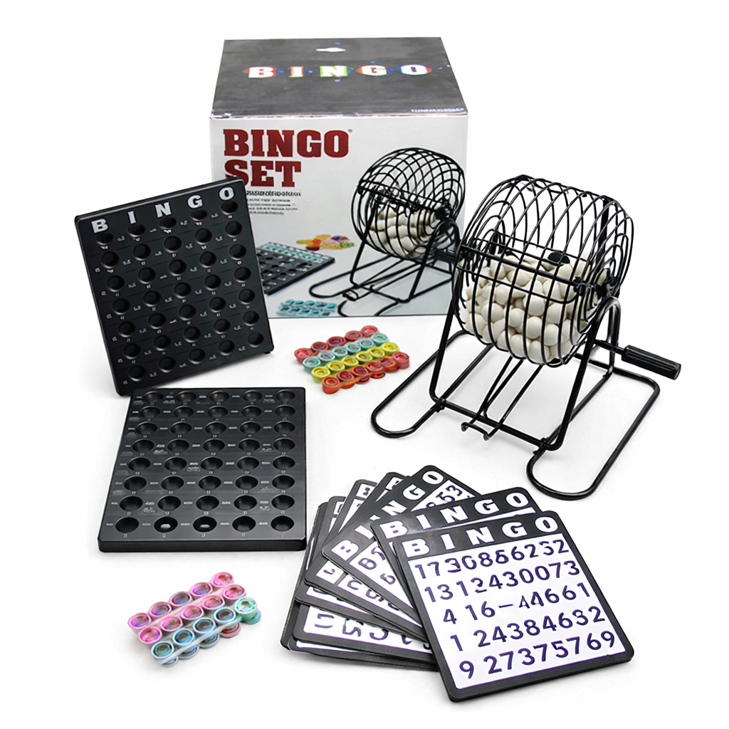 Incluye una esfera metálica resistente que permite mezclar las bolitas de manera uniforme, una bandeja organizadora, marcadores, 75 bolitas numeradas del 1 al 75 y 18 cartones diseñados para múltiples jugadores.