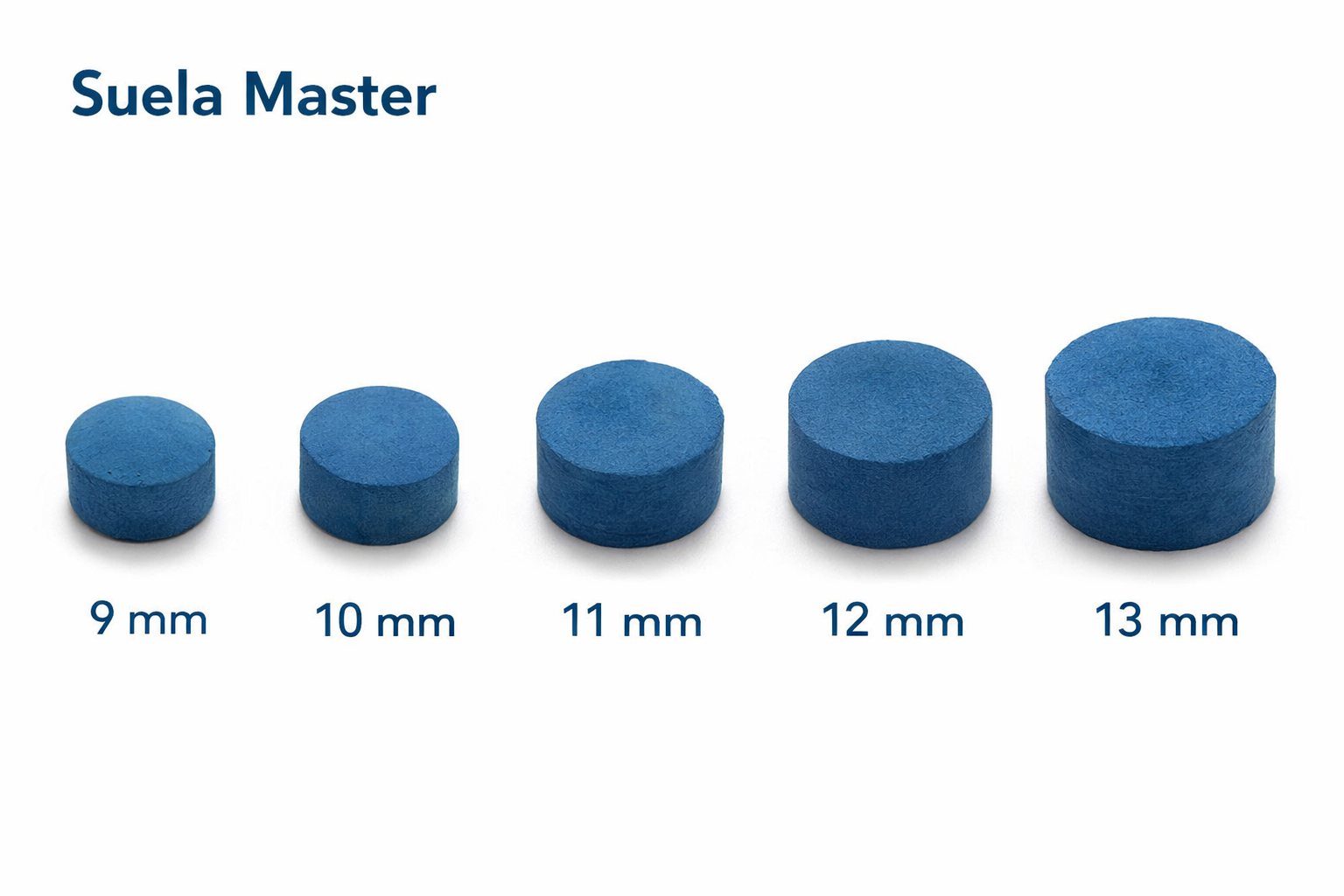Disponible en medidas 9, 10, 11, 12 y 13 mm, esta suela es compatible con una amplia variedad de tacos de pool. Su composición ofrece una buena absorción del impacto y una correcta retención de la tiza, ayudando a reducir deslizamientos no deseados.
