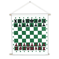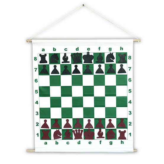 El tablero magnético enrollable de demostración para ajedrez tiene imanes pequeños pero fuertes para fijar las piezas negras y rojas brillantes coloreadas firmemente en su lugar. La notación algebraica coordina en los cuatro lados. El tablero es 29½ pulgadas de alto, 26 pulgadas de ancho con cuadrados de 2¾ pulgadas. Un cable se une a la clavija superior para colgar fácilmente el tablero en una pared o caballete. Retire las piezas y enrolle la tabla en su bolsa de transporte incluida.